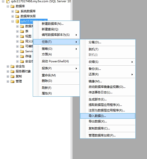 選擇數(shù)據(jù)庫(kù),右擊,在下拉菜單中選擇“任務(wù)”——“導(dǎo)入數(shù)據(jù)”