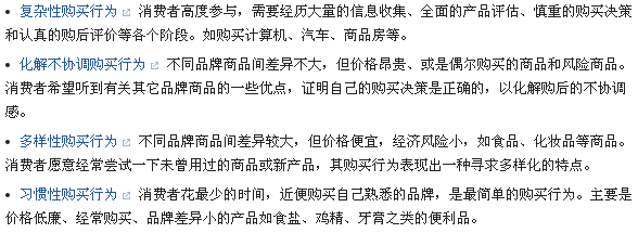 從上面可以見(jiàn)到,我們根據(jù)購(gòu)買(mǎi)者的參與程度和產(chǎn)品品牌差異程度可以區(qū)分出四種購(gòu)買(mǎi)類(lèi)型: