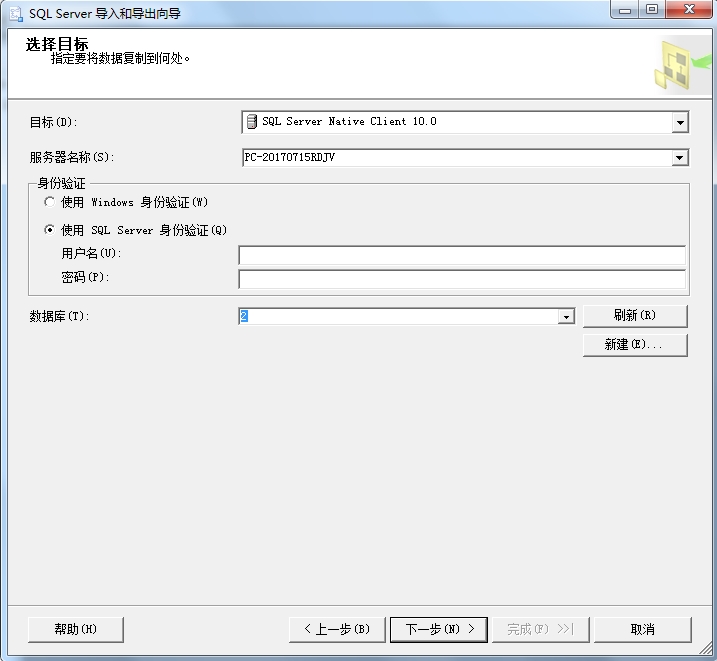 目標(biāo)中選擇SQL Server Native Client 10.0或者是默認(rèn),在服務(wù)器名稱右側(cè)點(diǎn)擊下拉箭頭選擇第一步鏈接到的服務(wù)器名稱(或者手動(dòng)輸入),根據(jù)已有信息,填寫用戶名密碼已經(jīng)數(shù)據(jù)庫(kù)名稱(即下圖中“2”的位置),點(diǎn)擊下一步;